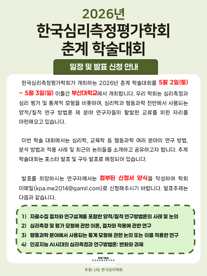 | Title | [한국심리측정평가학회] 2026 춘계 학술대회 일정 및 발표신청 안내 |