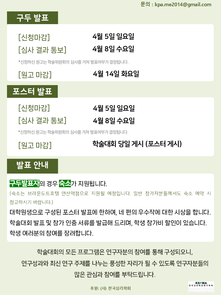안녕하세요, 한국심리측정평가학회입니다. 5월 2일(토) - 5월 3일(일) 부산대학교에서 춘계 학술대회를 개최합니다. 현재 포스터 및 구두 발표자를 모집 중에 있으니 많은 분들의 관심과 참여를 부탁드립니다. 자세한 사항은 첨부된 포스터 및 홈페이지를 참고해주시면 감사하겠습니다. |