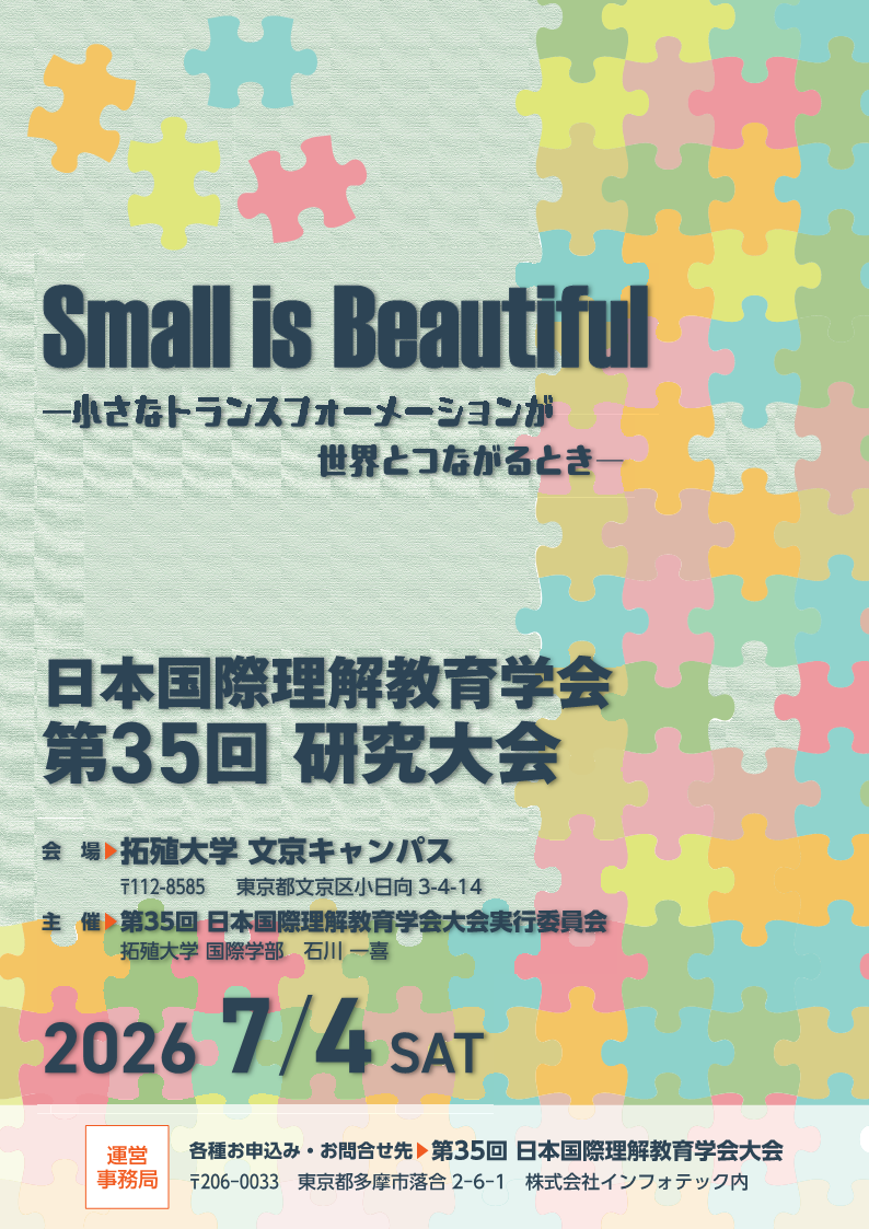 ![]() 한국국제이해교육학회 회원 여러분께 ▣ 일시: 2026년 7월 4일(토) ▣ 장소: 일본 도쿄 탁쇼쿠대학교, 분쿄 캠퍼스(拓殖大学 文京キャンパス) ▣ 신청 방법: 일본국제이해교육학회 제35회 연구대회 참가신청 링크(클릭) ▣ 신청 기한: - 자유 연구 발표 신청 마감 : 4/27(월) - 연구 발표 초록 원고 제출 마감 : 5/18(월) 한국국제이해교육학회 올림