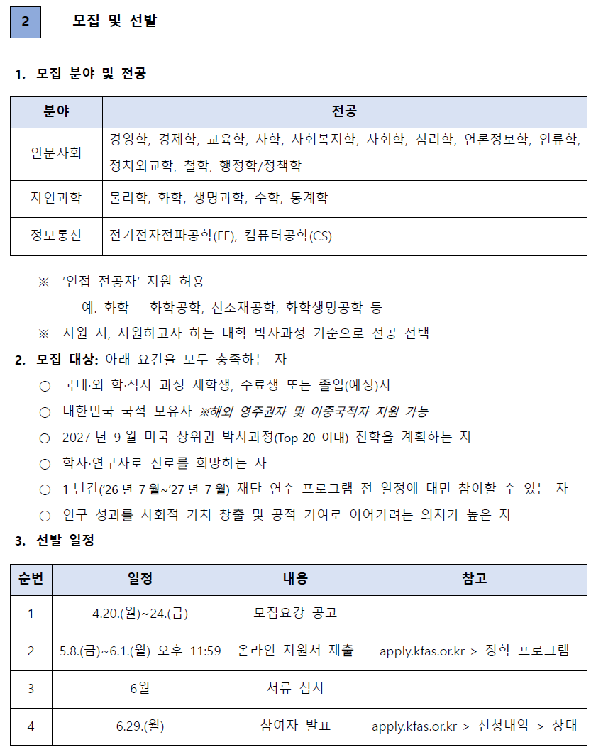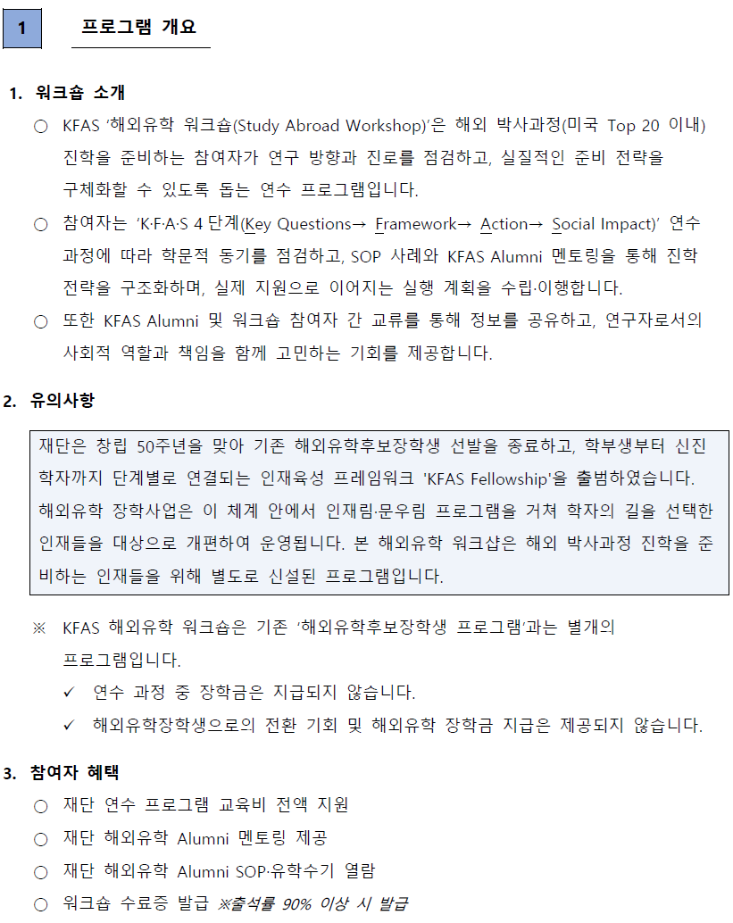 붙임2. 2026-2027년 KFAS '해외유학 워크숍(Study Abroad Workshop)' 모집요강.pdf 붙임3. 2026-2027년 KFAS '해외유학 워크숍(Study Abroad Workshop)' 포스터 (1).pdf 붙임4. 2026-2027년 KFAS '해외유학 워크숍(Study Abroad Workshop)' 참여자 모집 공고문.pdf |